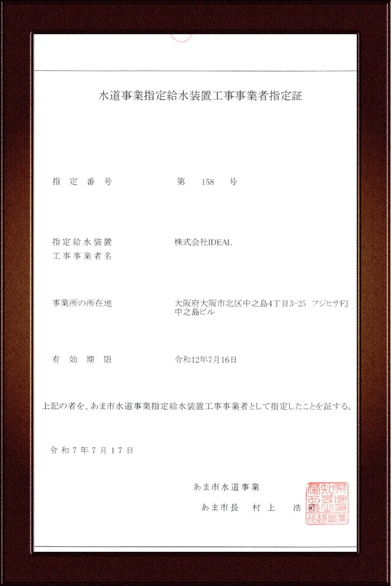 当社はあま市指定給水装置工事事業者です