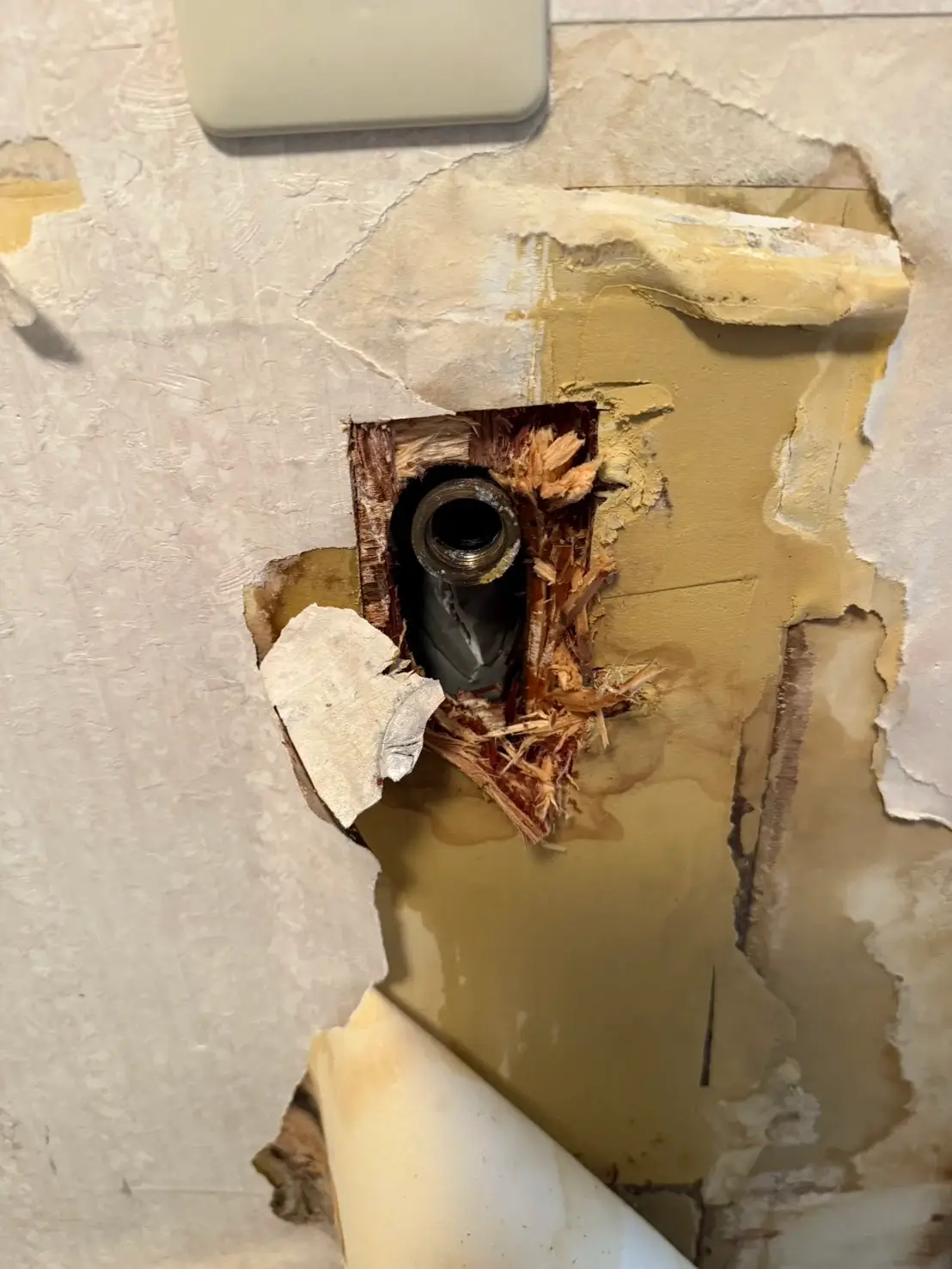 今回のケースは洗濯機用給水蛇口の接続部劣化により、壁内部へ水が浸透していた状態でした。